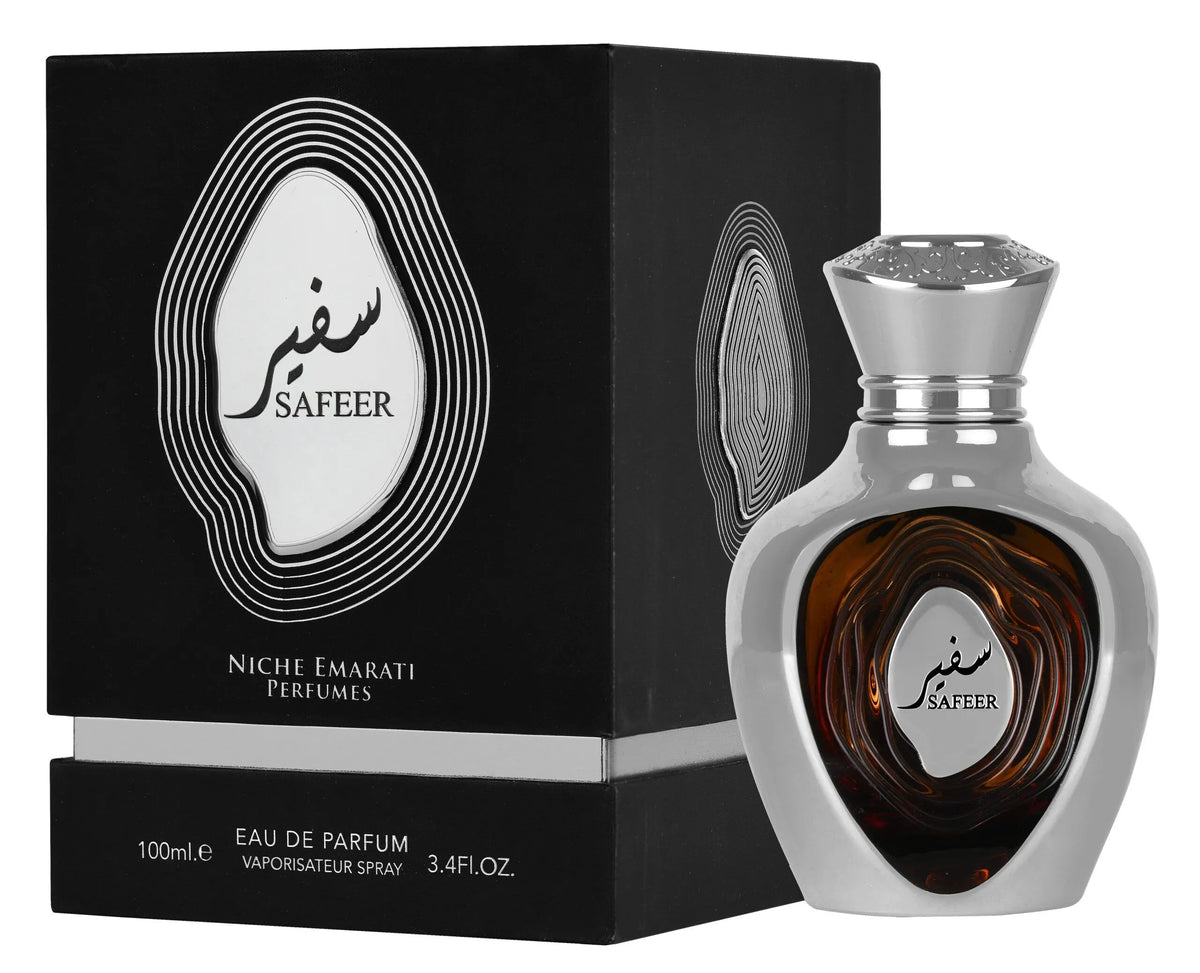 Niche Emarati Safeer by Lattafa Perfumes is a unisex Aromatic Citrus fragrance that opens with a crisp and invigorating burst of bergamot and lemon. The heart deepens with a sophisticated blend of juniper berry, clary sage, and nutmeg, adding subtle spiciness and aromatic depth. The base reveals a smooth, woody finish of tonka bean and cypress, leaving a warm and lingering impression.